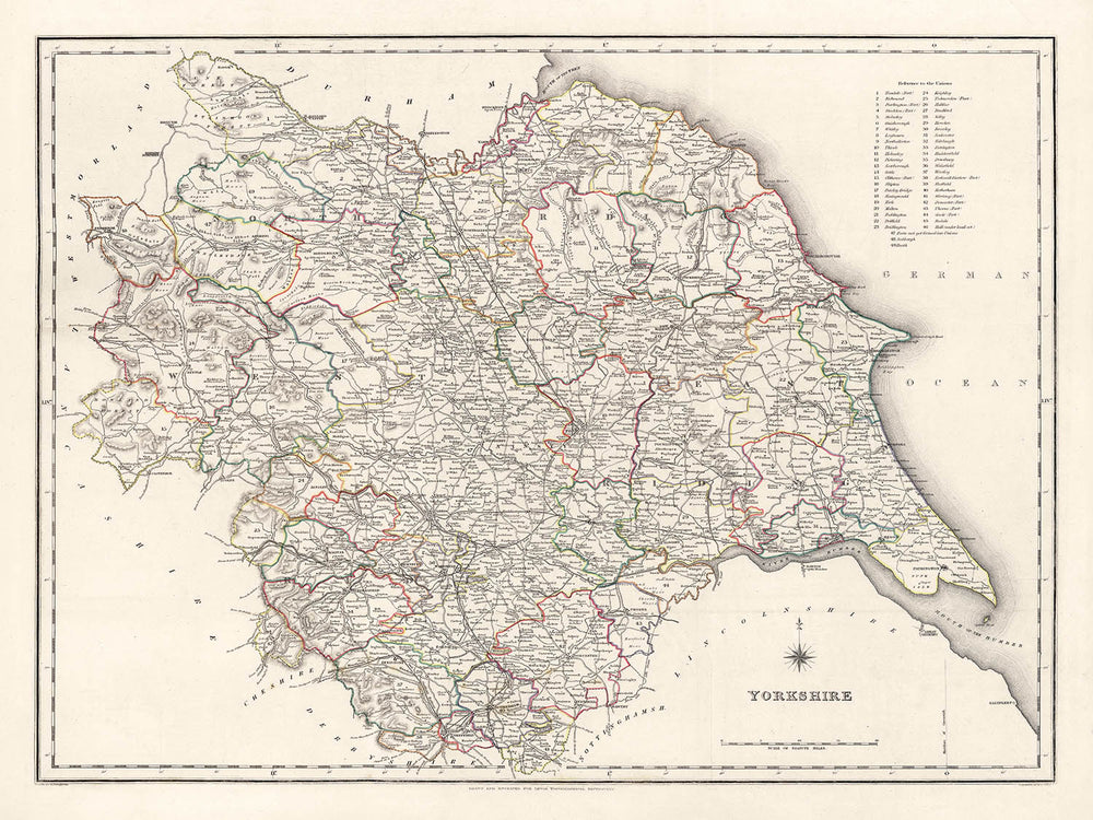 Antigua mapa de Yorkshire por Samuel Lewis, 1844: Leeds, Sheffield, Bradford, Kingston upon Hull y York