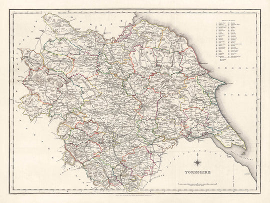 Esta impresionante pieza no solo tiene un inmenso valor histórico, sino que también sirve como un excelente punto de conversación. Ya sea la profunda transformación de Leeds de un modesto municipio de mercado a una bulliciosa ciudad industrial o el encanto perdurable de York, este mapa ofrece una fascinante visión del pasado de Yorkshire. Es una pieza perfecta para historiadores, cartógrafos o cualquier persona interesada en el rico tapiz del pasado de Yorkshire. La estética atemporal del mapa lo convierte en una excelente adición a cualquier decoración.