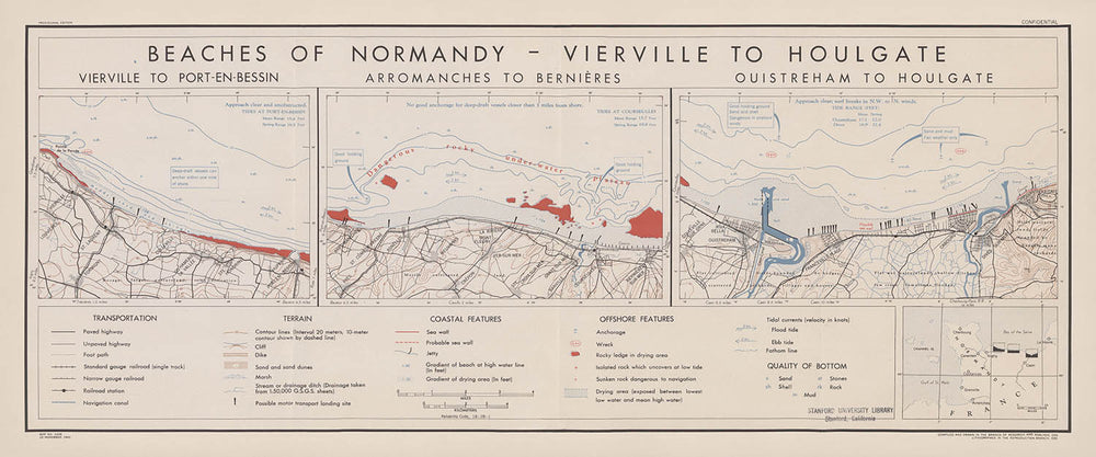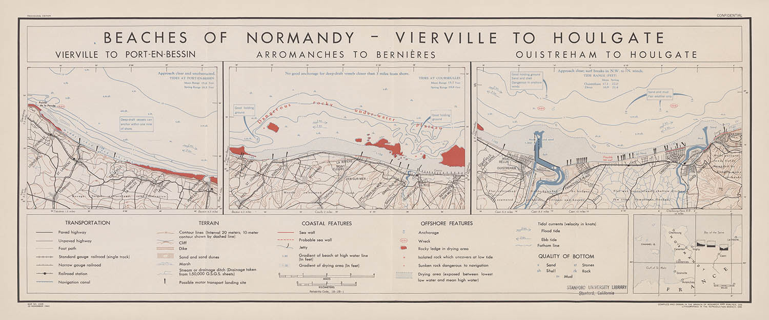 Antigua Mapa Militar de las Playas de Normandía, 1943: Planificación del Día D, Vierville a Houlgate, Arromanches