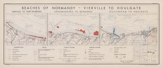 La importancia histórica del mapa se subraya por su creación durante un tiempo de conflicto global. La OSS, un precursor de la CIA, produjo este mapa como parte de sus esfuerzos de inteligencia durante la guerra. Su representación detallada de la costa de Normandía proporcionó información esencial para los estrategas militares, ayudando en la exitosa ejecución de la Operación Overlord. Este mapa no solo destaca las características geográficas de la región, sino que también sirve como un testimonio de la meticulosa planificación y coordinación que fueron vitales para la victoria aliada en Europa.