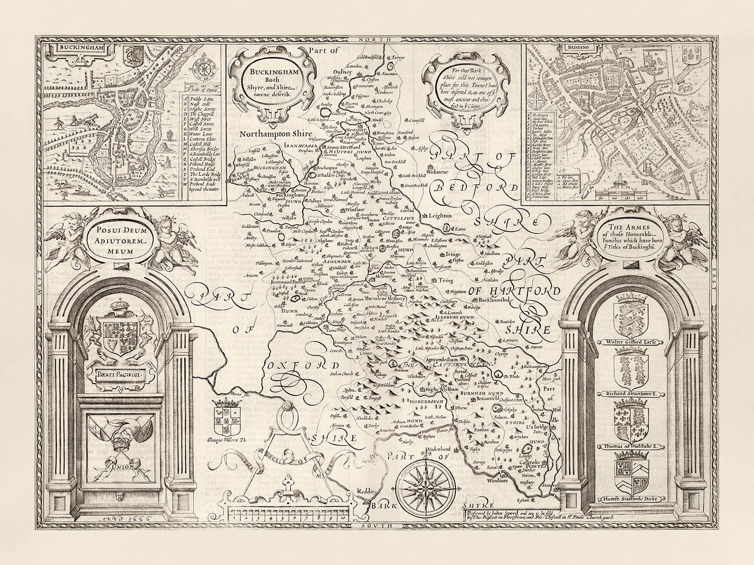 Muchas de las ciudades, pueblos y aldeas en Buckinghamshire ya son visibles en este mapa. Milton Keynes aún no existía por nombre, pero sus componentes, como Newport, sí.