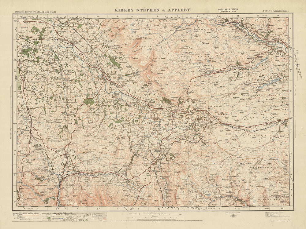 Este mapa meticulosamente detallado y bellamente conservado, titulado "Sheet 13 - Kirkby Stephen & Appleby", es una pieza notable de la edición "Popular" de una pulgada de Inglaterra y Gales del Ordnance Survey, publicada en 1925. El mapa muestra las ciudades históricas de Kirkby Stephen y Appleby, junto con varios otros asentamientos notables y características cautivadoras.