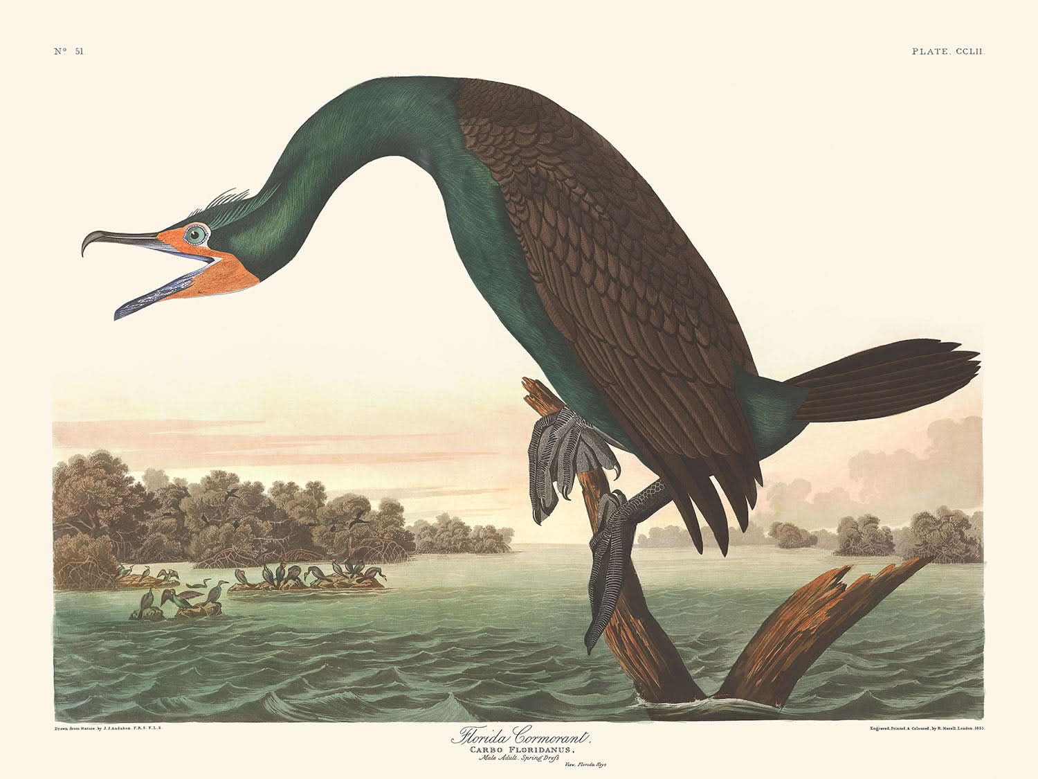 El Cormorán de Florida (Placa 252) creado por John James Audubon en 1827, es una ilustración notable de su célebre obra, Las Aves de América, que captura la esencia de esta especie de ave distintiva. Audubon, conocido por su rica herencia naturalista y sus magistrales representaciones de aves, presenta el Cormorán de Florida en exquisito detalle, enmarcado en un fondo de su hábitat natural, proporcionando una vívida visión de la vida de este residente aviar a menudo pasado por alto en las regiones costeras de América.