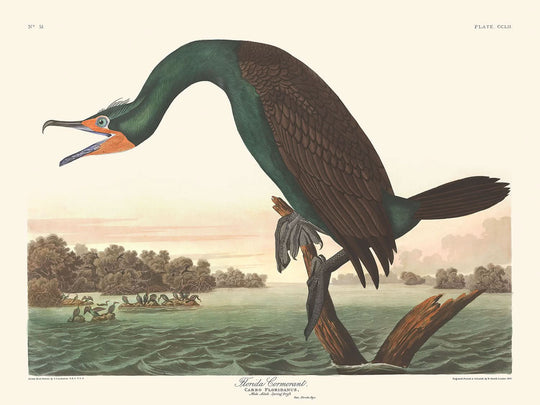 El Cormorán de Florida es especialmente notable por su presencia impactante y comportamientos únicos, como lo describe Audubon. Prefiere las vías fluviales interiores, anidando en árboles a diferencia de sus parientes que prefieren rocas o acantilados. Observando su naturaleza comunal y hábitos de reproducción, Audubon capturó la esencia de la especie, enfatizando sus elecciones de cría gregarias pero selectivamente solitarias. Esta impresión fina ofrece a los espectadores más que una representación; proporciona una visión de la historia natural de estas aves durante la época de la exploración americana temprana.