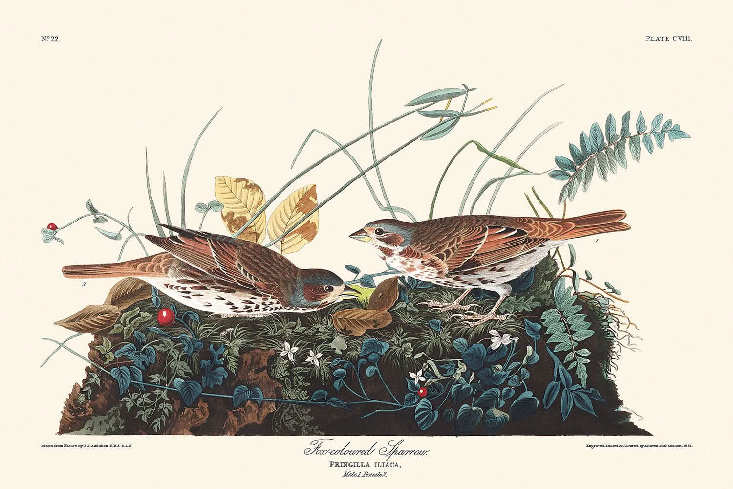 Publicada por primera vez en 1827, "Gorrión color zorro" del renombrado John James Audubon, es una exquisita ilustración de aves de su célebre obra, Las Aves de América. Audubon fue un naturalista pionero cuyas meticulosas representaciones de aves americanas han cautivado al público durante casi dos siglos. Su retrato detallado y vívido del Gorrión color zorro—un ave conocida por su melodioso canto y su plumaje vibrante—es un testimonio de su habilidad inigualable y dedicación a capturar la belleza de la naturaleza.