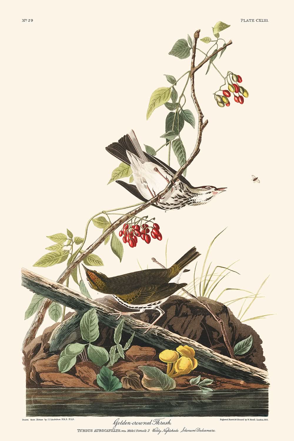 La ilustración del Zorzal de corona dorada es famosa por su representación del hábitat distintivo de esta ave (bosques sombreados a lo largo de arroyos y riachuelos) y sus hábitos migratorios en América del Norte. La obra de arte también destaca los hábitos de anidación únicos de esta ave, con nidos diseñados para parecerse a hornos, camuflados entre hojas y hierbas. Este estudio íntimo muestra la capacidad de Audubon para combinar el arte con la historia natural a la perfección.