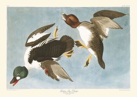 El Pato Ojos Dorados (Placa 342) de John James Audubon es una cautivadora ilustración de aves publicada originalmente en 1827 como parte de la famosa colección de Audubon, Aves de América. Esta obra maestra destaca al renombrado Pato Ojos Dorados, un audaz viajero conocido por sus extensas migraciones a través de América del Norte, desde las heladas latitudes del norte hasta las amplias bahías de Massachusetts y los campos de arroz de Carolina del Sur durante el invierno.