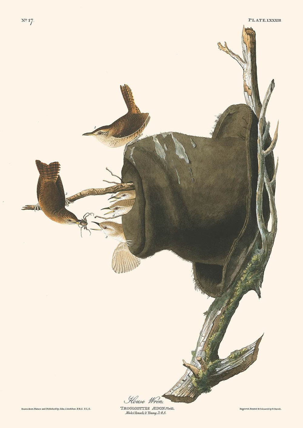 El reyezuelo doméstico, una magnífica ilustración de aves de la aclamada obra de John James Audubon Aves de América, se publicó por primera vez en 1827. Esta encantadora ilustración captura la intensidad y la naturaleza vivaz del cucarachero doméstico, una especie que Audubon observó ampliamente en los estados de Pensilvania, Nueva Jersey, Virginia y Maryland durante los meses más cálidos.