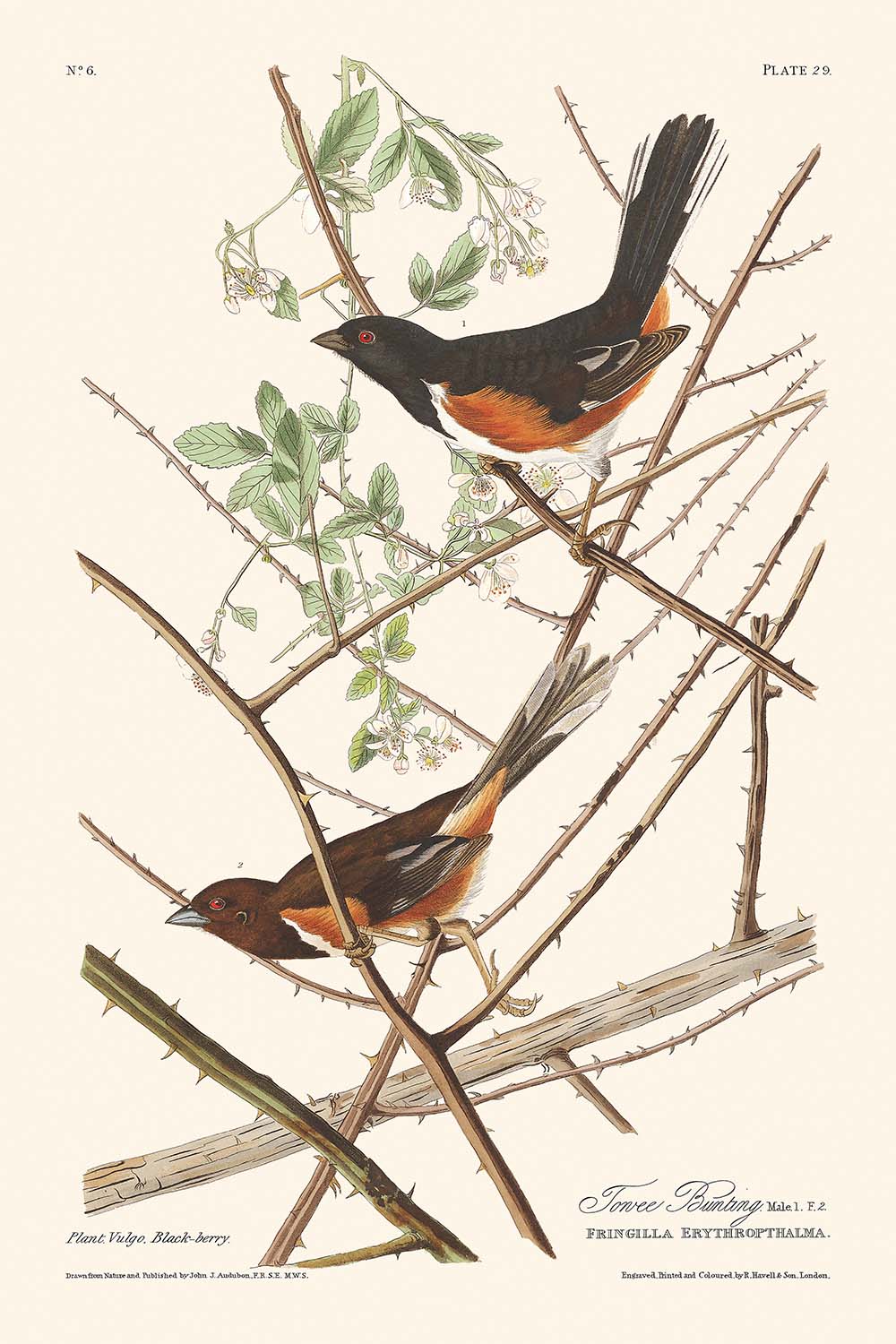 El uso del color por parte de Audubon es particularmente impactante en esta pieza, con tonos dominantes de negro y blanco en las plumas del Towhee, contrastados bellamente con los tonos terrosos del fondo y el verde del espino, creando una escena visualmente cautivadora y armoniosa. Los detalles meticulosos en el plumaje y la flora realzan su atractivo visual, convirtiéndola en una adición digna a la decoración de tu hogar u oficina.