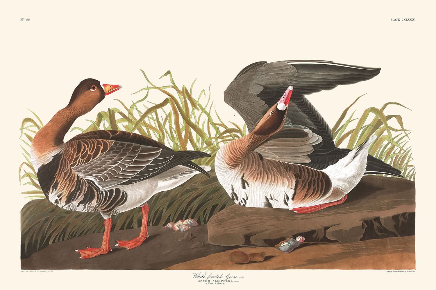 La experiencia de Audubon en el detalle del plumaje, como el cuello de un intenso color marrón grisáceo y el cuerpo gris oscuro del ganso de frente blanca, añade profundidad visual a esta composición. La representación del ave, con su pico rojo carmín y sus patas anaranjadas, es una representación evocadora de la vida salvaje estadounidense y un recordatorio de la pasión de toda la vida de Audubon por el mundo natural.