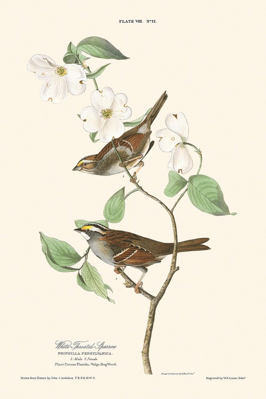 El gorrión de garganta blanca, publicado por primera vez en 1827, muestra el exquisito arte de John James Audubon, un famoso naturalista y pintor. Esta icónica ilustración es parte de su obra maestra, Las aves de América, que sigue siendo célebre por su inmenso detalle y belleza.