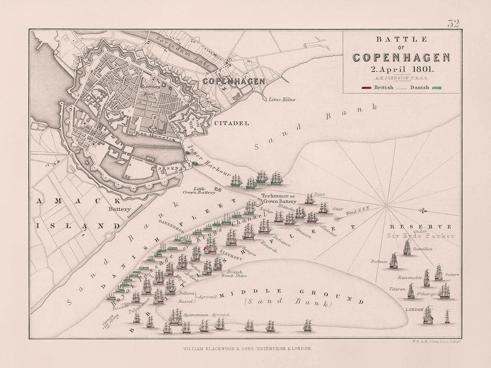 AK Johnston es una figura destacada en el ámbito del arte cartográfico, reconocido por su astuta capacidad para combinar la precisión geográfica con la excelencia artística. La "Batalla de Copenhague, 2 de abril de 1801" es un ejemplo de su arte, ya que muestra las posiciones cruciales de las flotas bajo el mando de Sir Hyde Parker, con el telón de fondo de unos mares maravillosamente caóticos.