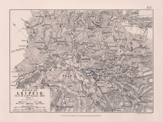 A AK Johnston se lo recuerda por sus notables contribuciones a la cartografía histórica durante un período cargado de convulsiones militares y políticas. Esta litografía formaba parte de un atlas destinado a complementar el profundo relato histórico de la "Historia de Europa" de Alison, que detalla los acontecimientos desde la Revolución Francesa hasta la restauración de los Borbones. El atlas incluye 108 mapas detallados que revelan las estrategias y posiciones de fuerzas como la caballería, la infantería y la artillería francesas y aliadas durante la batalla, que se vuelven más vívidas gracias a la aplicación experta del color a mano.