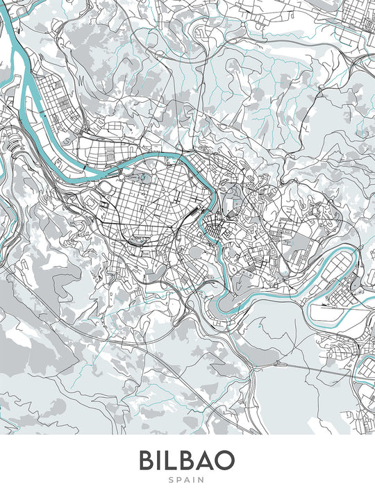 Este mapa de Bilbao es una obra maestra moderna que captura la esencia de esta vibrante ciudad española. Con sus líneas limpias y su diseño minimalista, este mapa es una verdadera obra de arte que agregará un toque de sofisticación a cualquier hogar u oficina. El mapa se centra en la zona central de Bilbao, mostrando sus barrios y puntos de referencia más emblemáticos.