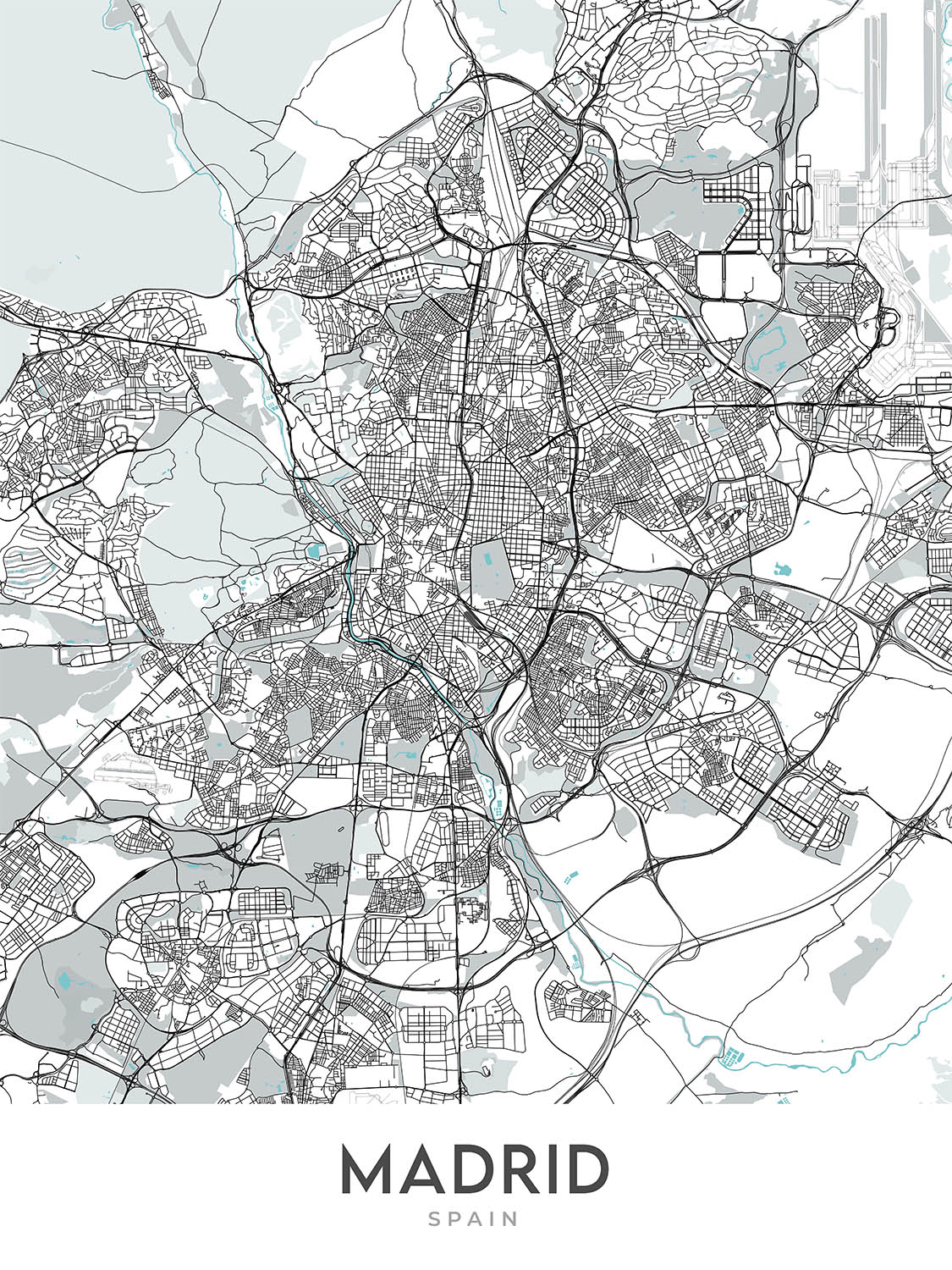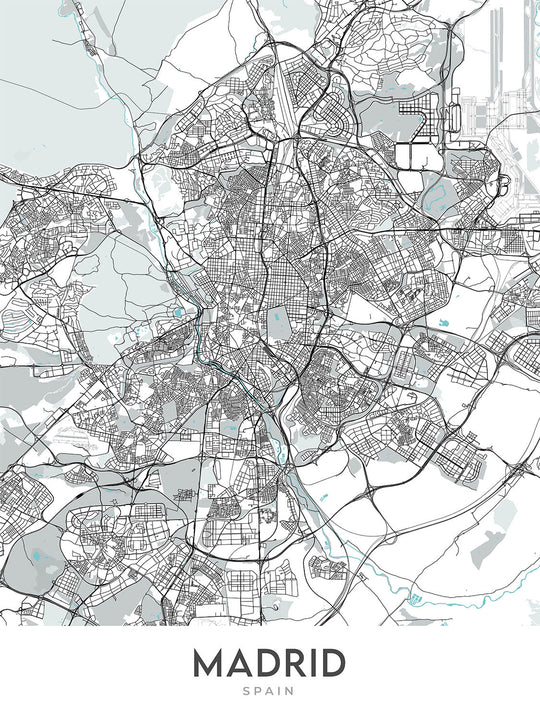 Este mapa de Madrid, la capital de España, es una obra de arte cartográfica moderna y detallada que se centra en el trazado de las calles de la ciudad. El mapa cubre una gran área de la ciudad, incluidos muchos de sus barrios y puntos de referencia más famosos.