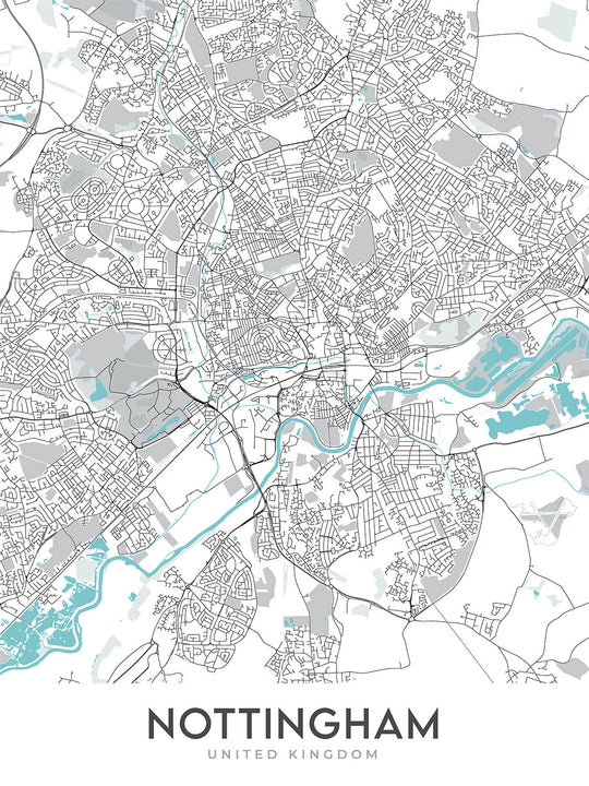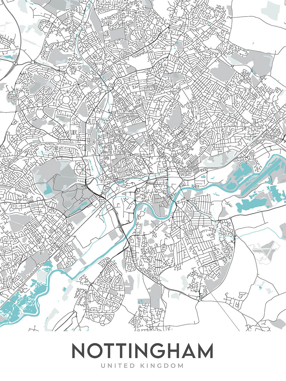 Este mapa de Nottingham es un callejero moderno y detallado sin etiquetas, perfecto para añadir un toque de estilo contemporáneo a cualquier hogar u oficina. El mapa cubre una amplia zona de la ciudad, incluido el centro de la ciudad, The Park, Lenton, Beeston, Wollaton, West Bridgford, Carlton, Arnold, Mapperley y Sherwood.