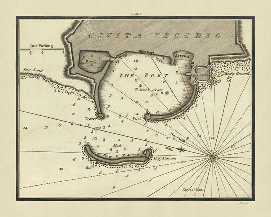 El mapa muestra Civitavecchia, Italia, en un período de significativo cambio histórico, destacando características marítimas y arquitectónicas clave como el puerto, el arsenal y el imponente castillo. La representación detallada incluye sondeos, rocas, arrecifes y otros peligros, cruciales para la navegación y la comprensión del paisaje marítimo de la época. Notablemente, el mapa también presenta un nuevo muelle meticulosamente dibujado y un faro, señalando los avances en la infraestructura marítima que eran contemporáneos a la época.
