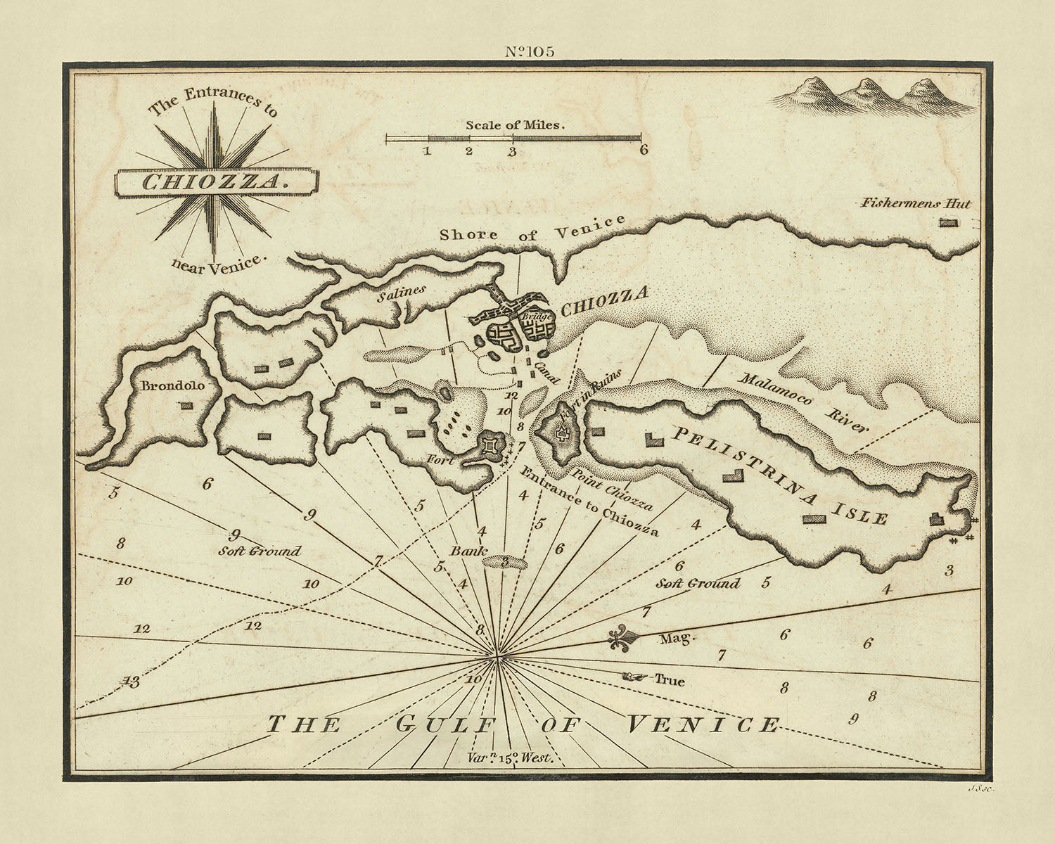 El gráfico de Heather está meticulosamente detallado, presentando sondeos, anclajes y contornos topográficos que proporcionan información invaluable para la navegación. Está orientado con el oeste en la parte superior, una elección poco convencional que enfatiza el enfoque desde el Mar Adriático hacia el Golfo de Venecia. El mapa delimita varias vías fluviales clave, incluyendo los ríos Po, Adige y Brenta, que son cruciales para entender la hidrográfica de la región. La inclusión de planos para el pueblo de Chioggia y otros puntos de interés no solo ayuda en la navegación marítima, sino que también enriquece la comprensión del espectador sobre la disposición geográfica de la zona y los asentamientos humanos durante principios del siglo XIX.