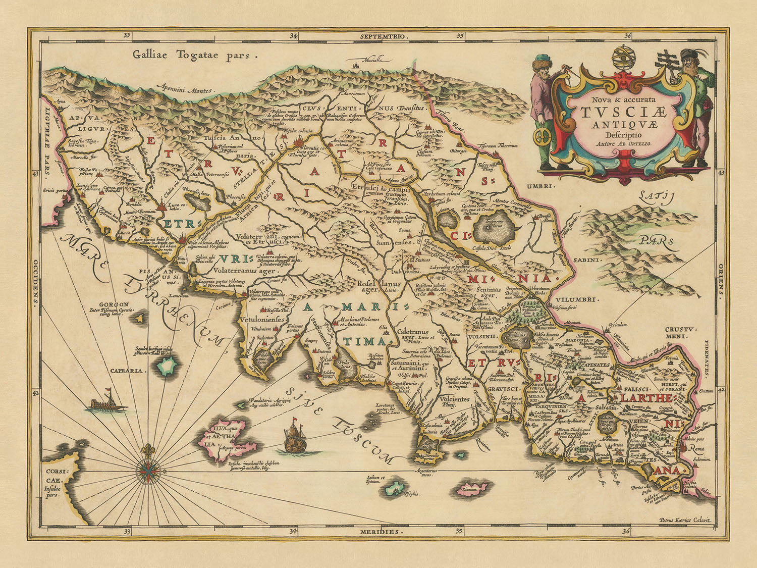 Mapa antiguo de la Toscana antigua por Jansson, 1652: Ciudades-Estado etruscas, Lacio, Umbría, asentamientos y caminos romanos, Apeninos, río Arno