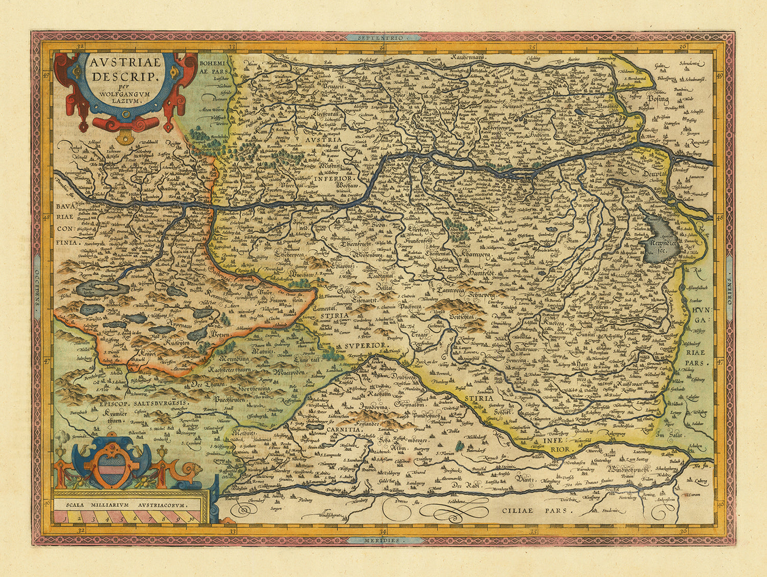 Lo que hace que este mapa sea particularmente interesante es su reflejo del contexto geopolítico de finales del siglo XVI. En el momento de su creación, Austria formaba parte de la poderosa Monarquía de los Habsburgo, que dominaba gran parte de Europa. El mapa proporciona así una instantánea de una época en la que las fronteras eran fluidas y estaban sujetas a los caprichos de monarcas poderosos. Además, el creador del mapa, Abraham Ortelius, es conocido como el inventor del atlas moderno, lo que hace de esta pieza no sólo un mapa, sino una pieza de la historia cartográfica. Su enfoque innovador en la elaboración de mapas es evidente en las representaciones detalladas de ciudades, cuerpos de agua y otras características geográficas, lo que hace de este mapa una valiosa adición a cualquier colección.