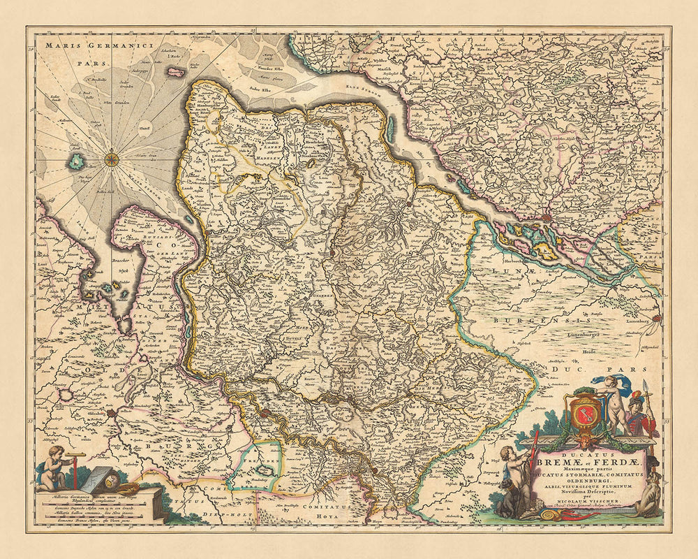 Sumérgete en la rica historia del norte de Alemania con este mapa meticulosamente detallado de Nicolaes Visscher II, un reconocido cartógrafo de la Edad de Oro holandesa. Creado en 1690, este mapa, titulado oficialmente 'Ducatus Bremae et Ferdae, Maximaeque partis Ducatus Stormariae, Comitatus Oldenburgi, Albis, Visurgisque Fluluminum Novissima Descriptio', se centra en las regiones de Bremen y Verden, con características notables que incluyen las ciudades de Hamburgo, Oldenburg , Lüneberg, Bremerhaven y Stade.