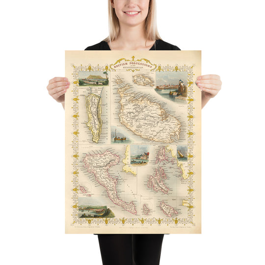 El mapa está decorado con viñetas grabadas de Gibraltar, La Valeta, Vathi, Ítaca y Corfú, así como dos vistas de barcos pesqueros griegos. El mapa también está coloreado a mano, con las posesiones británicas en rosa.