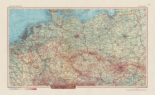 El enfoque principal del mapa es Europa Central, una región impregnada de historia y diversidad cultural. Captura la esencia de las características geográficas únicas y las fronteras políticas de la región, convirtiéndolo en un interesante mapa nacional. Al espectador se le ofrece una ventana al pasado, con la oportunidad de observar la intrincada red de fronteras y comprender el contexto geográfico de los eventos históricos. La representación detallada del mapa de Alemania, Polonia, Chequia, Bélgica y los Países Bajos proporciona una perspectiva única sobre la interconexión de estas naciones.