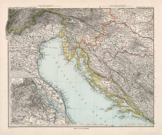 Este antiguo mapa de Croacia y Bosnia, creado originalmente por Adolf Stieler en 1894, ofrece una visión de la rica historia y los cautivadores paisajes de estos dos países. El mapa abarca el impresionante mar Adriático y muestra la pintoresca costa dálmata y sus numerosas islas. Una característica destacada son las montañas Velebit, una majestuosa cadena que se extiende a lo largo de la costa oriental de Croacia. Este mapa sirve como testimonio de la belleza natural y la importancia histórica de la región, lo que lo convierte en una valiosa adición a cualquier colección.