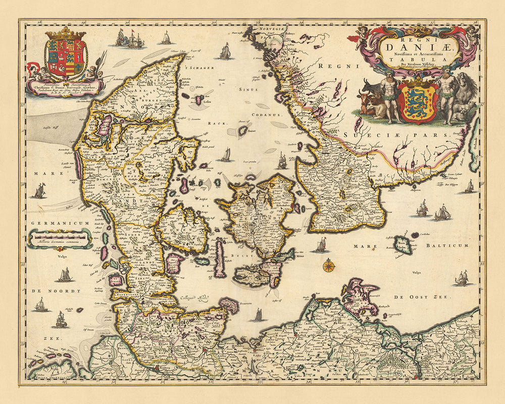 Finalmente, el mapa ilustra el Parque Nacional del Mar de Wadden, declarado Patrimonio de la Humanidad por la UNESCO conocido por su exclusivo sistema de llanuras de marea. Esta inclusión habla de la naturaleza integral del mapa, capturando no sólo asentamientos urbanos sino también hitos naturales importantes. Este mapa 'Regni Daniae: Novissima et accuratissima tabula' es un testimonio de las habilidades cartográficas de Visscher y un notable artefacto de geografía histórica.