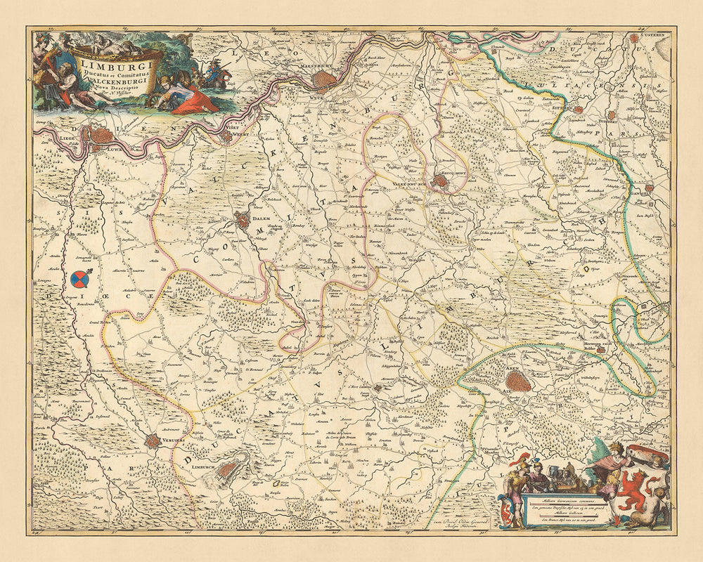 Nicolaes Visscher II, el creador de este mapa, proviene de un linaje de reconocidos cartógrafos holandeses. Su abuelo, Claes Janszoon Visscher, fue uno de los mejores cartógrafos del Siglo de Oro holandés. Nicolaes Visscher II continuó con este legado, creando mapas que no sólo eran precisos sino también estéticamente agradables. Este mapa del ducado de Limburgo y del condado de Valkenburg es un testimonio de su habilidad y artesanía.