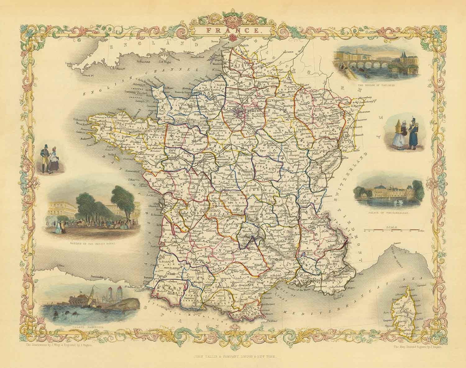 Grabado por John Rapkin y publicado por J. Tallis & Co en 1851, este es uno de los mapas históricos de Francia más finos y detallados. Este mapa fue originalmente coloreado a mano hace más de 150 años y ha sido restaurado con tacto por The Unique Maps Co.