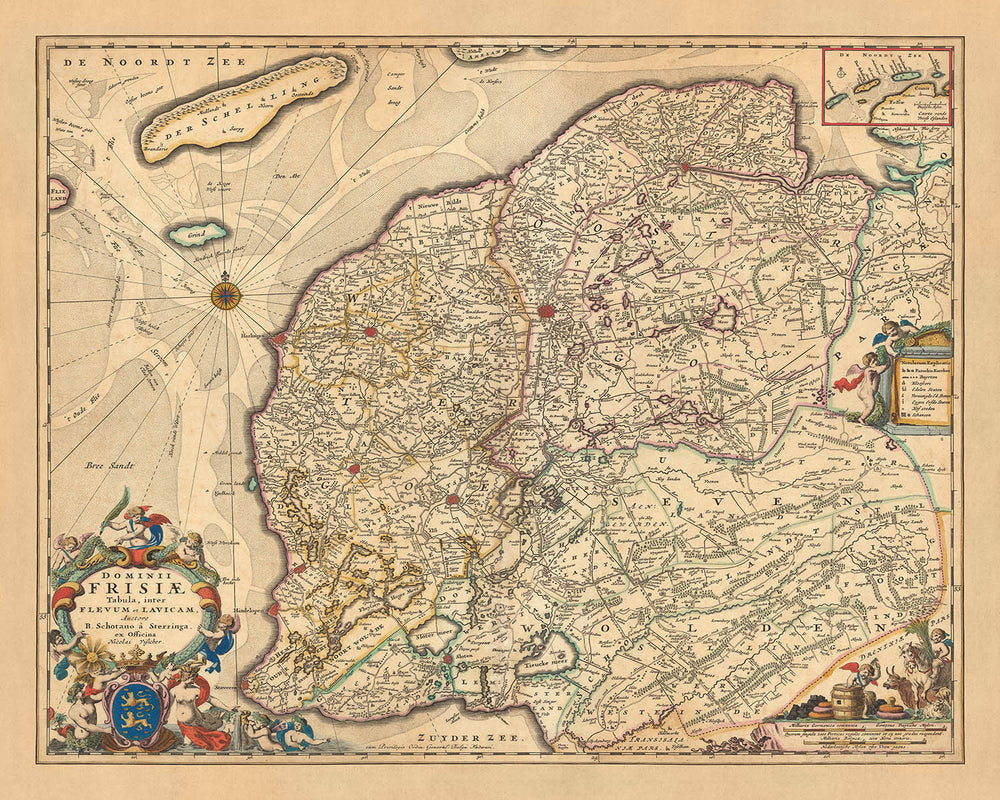 Más allá de estas ubicaciones específicas, el mapa ofrece una visión completa de las divisiones políticas y regiones de Frisia a finales del siglo XVII. Esto proporciona una visión fascinante del contexto histórico y político de la época, lo que convierte a este mapa en un recurso valioso para aquellos interesados en la historia de los Países Bajos, la Edad de Oro holandesa o la cartografía en general. Experimente el pasado a través de la lente de Nicolaes Visscher II con este impresionante mapa de Frisia.