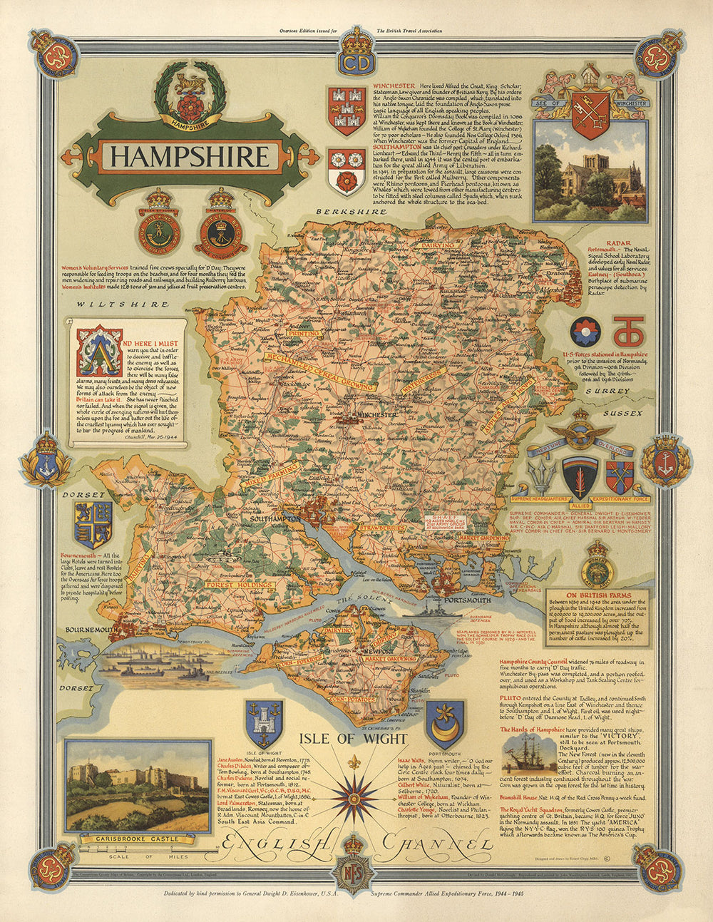 Además de un mapa detallado del condado de Hampshire en el medio, Clegg ha adornado este mapa con muchas ilustraciones y hechos altamente detallados y hermosos sobre lugares notables. Estos incluyen Winchester, Southampton, Radar y Bournemouth.