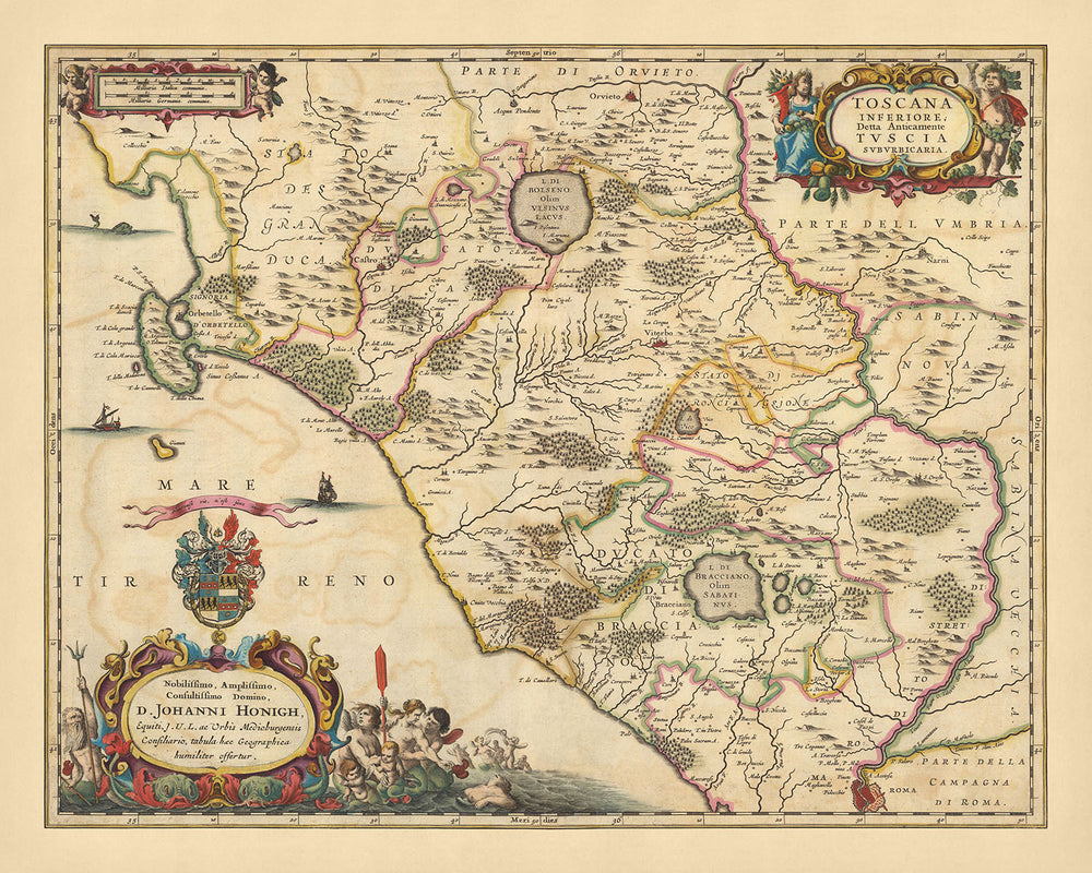 El mapa presenta varias ciudades y puntos de referencia importantes, incluidos Viterbo, Roma, Orvieto, Civitavecchia y el Parco Naturale Regionale di Bracciano Martignano. Cada ciudad está representada con notable precisión, lo que refleja la meticulosa atención al detalle que fue un sello distintivo del trabajo de Visscher. Estas ciudades, ricas en historia y cultura, están bellamente capturadas en esta pieza, que ofrece una mirada al pasado que es a la vez fascinante y educativa.