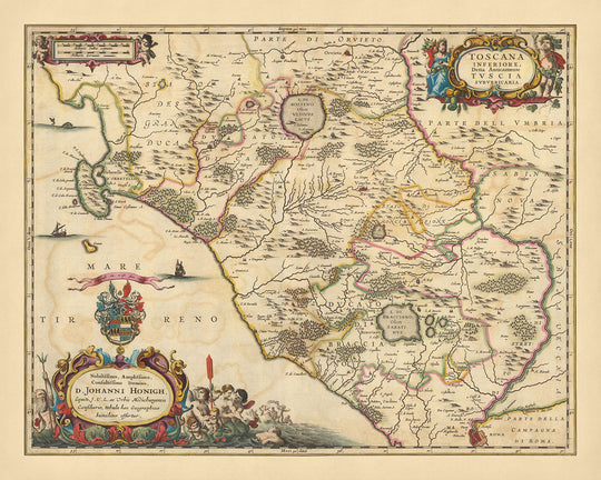 Sumérgete en el rico tapiz de la historia con nuestro exquisito mapa, 'Toscana inferiore, detta anticamente Tuscia suburbicaria', que se traduce como 'Baja Toscana, antes conocida como Toscana suburbana'. Esta pieza, meticulosamente elaborada por Nicolaes Visscher II en 1690, muestra las regiones y divisiones políticas de la Baja Toscana, un área que ahora forma parte de la Italia actual. Visscher II fue un renombrado cartógrafo del Siglo de Oro holandés y su experiencia es evidente en la precisión y el detalle de este mapa.