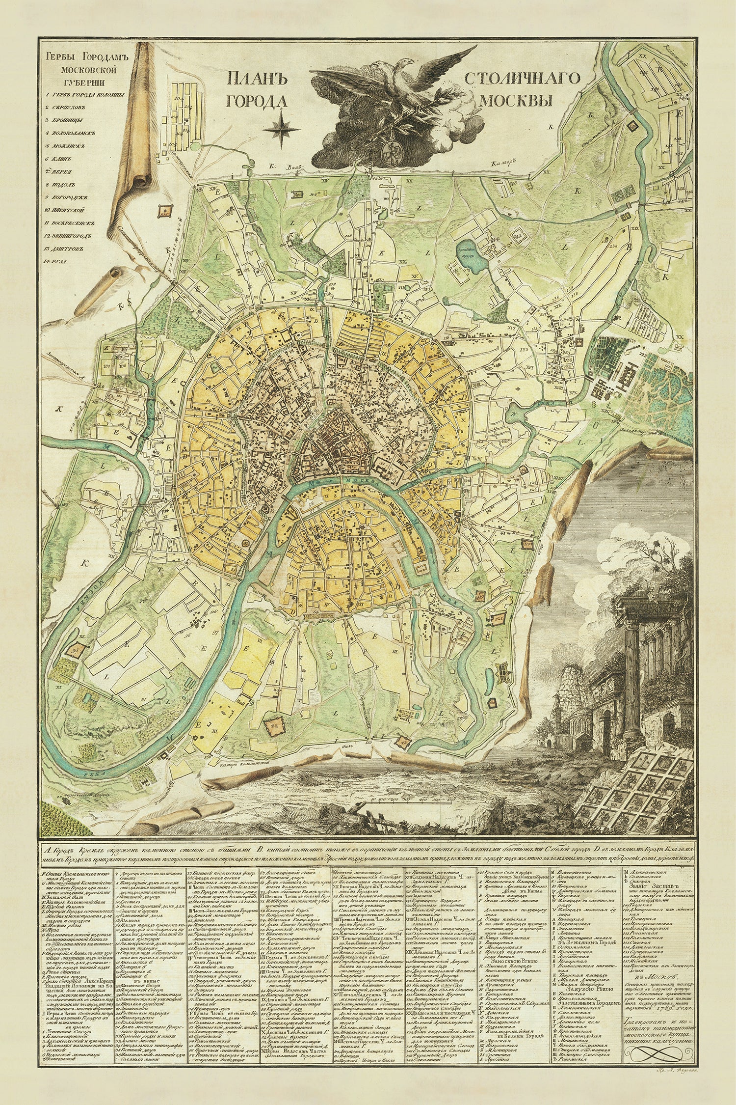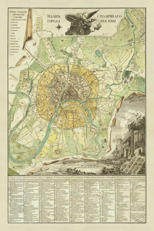 Este raro y fascinante mapa de Moscú fue creado por Ivan Marchenkov en 1789. Representa la ciudad con gran detalle, mostrando sus calles, edificios y vías fluviales. El mapa también está adornado con hermosas ilustraciones de algunos de los lugares más emblemáticos de Moscú, como el Kremlin, el río Moscú y el río Yauza.