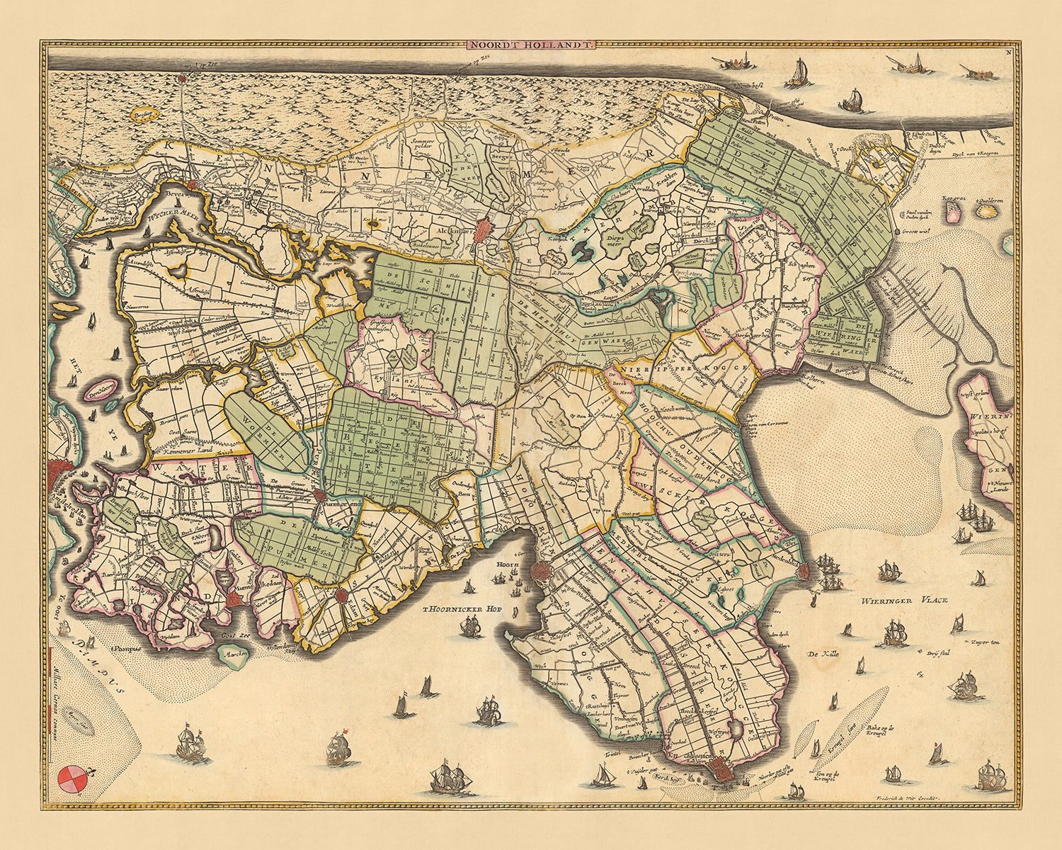 'Noordt Hollandt', traducido como 'Holanda Septentrional', indica el enfoque geográfico del mapa. Esta región, conocida por su paisaje llano, molinos de viento, campos de tulipanes y canales, fue un área clave durante la Edad de Oro holandesa, un período de gran riqueza y logros culturales. Por lo tanto, el mapa ofrece una visión de la rica historia y el patrimonio de esta notable región.