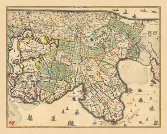 Este mapa 'Noordt Hollandt' de Nicolaes Visscher II es imprescindible para cualquier entusiasta de la historia o la cartografía. Es una pieza única que combina importancia histórica, artesanía artística y detalles geográficos, ofreciendo una ventana al pasado de una de las regiones más fascinantes de Europa.