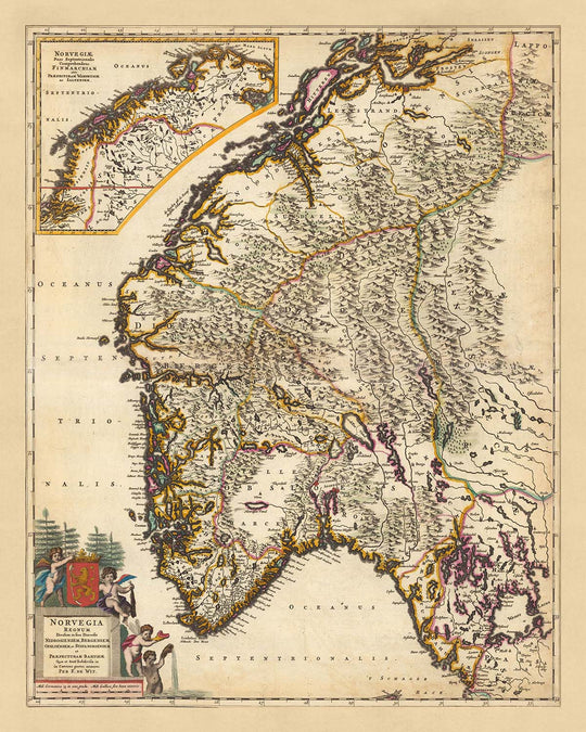 Este exquisito mapa, 'Norvegia regnum: divisum in suos dioeceses Nidrosiensem, Bergensem, Opsloensem, et Stavangriensem et praefecturam Bahusiae quae et sont subdivisae in in caeteras partes, minores', es un testimonio de la meticulosa artesanía de Nicolaes Visscher II, un renombrado cartógrafo. del Siglo de Oro holandés. Creado en 1690, el mapa presenta una descripción detallada de Noruega y ofrece una visión del panorama histórico y político del país.