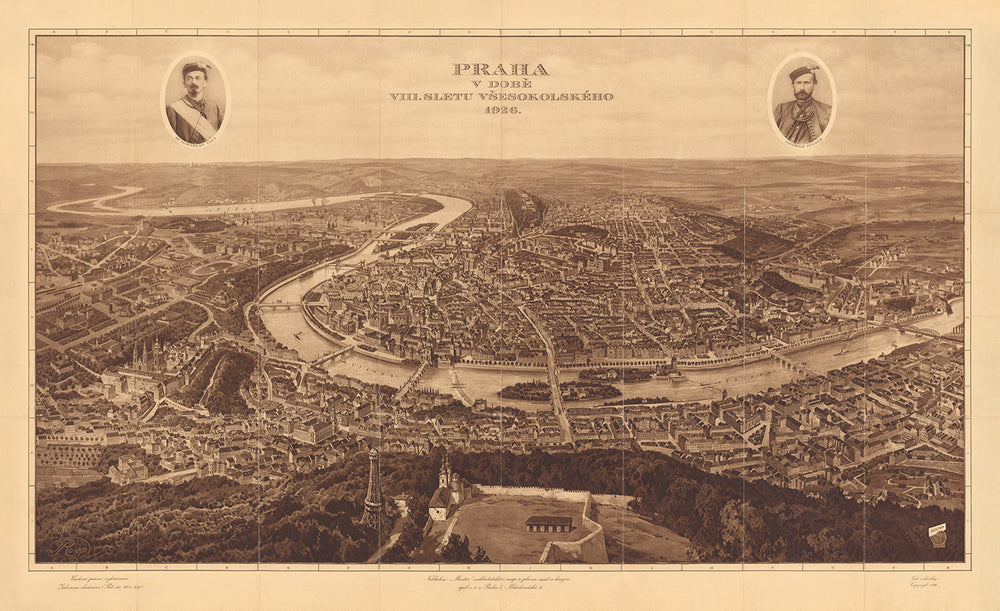 Este exquisito mapa, 'Praha V Době VIII. Sletu Všesokolského 1926', es una representación única de Praga, una de las ciudades más encantadoras del mundo. Elaborado con meticulosa atención al detalle por Mentor en 1926, presenta una vista aérea de la ciudad, revelando su disposición y puntos de referencia de una manera que es tanto visualmente cautivadora como históricamente informativa. La perspectiva desde Petrin, mirando hacia el este, ofrece una vista panorámica de la ciudad, con Mala Strana en primer plano y el Casco Antiguo y el Casco Nuevo al otro lado del río en el medio del mapa. Las características prominentes como la Torre de Petrin y el Castillo de Praga son claramente visibles, añadiendo al atractivo de este mapa.