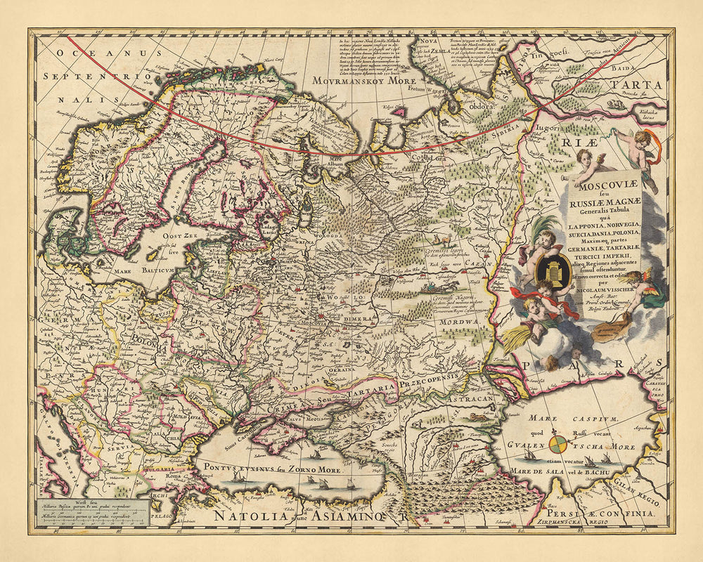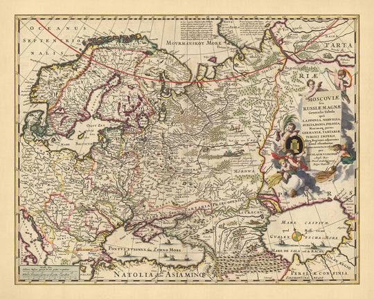 El mapa de Visscher también proporciona información sobre los paisajes naturales y las características geográficas de la región. Muestra la inmensidad del terreno ruso, desde los Montes Urales, que sirven como frontera natural entre Europa y Asia, hasta el río Volga, el río más largo de Europa, que atraviesa el centro de Rusia. El mapa también alude a la tundra ártica de Laponia y las extensas llanuras de Tartaria, partes de la actual Asia Central.