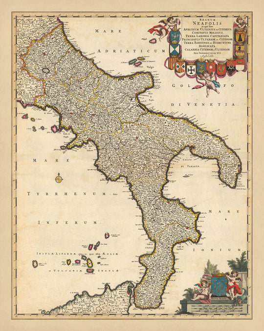 Descubra un pedazo de historia con este exquisito mapa titulado 'Regnum Neapolis: in quo sunt Aprutium Ulterius et Citerius, Comitatus Molisius, Terra Laboris, Capitaniata Principatus Ulterior et Citerior Terra Bariensis et Hidruntina Basilicata, Calabria Citerior et Ulterior'. En inglés, esto se traduce como "Reino de Nápoles: en el que hay Aprutium más y más cerca, condado de Molise, Tierra del Trabajo, Capitanía del Principado más y más cercano, Tierra de Bari e Hydruntum, Basílicata, Calabria más cerca y más". Este mapa, creado por Nicolaes Visscher II en 1690, proporciona una vista detallada del Reino de Nápoles y sus regiones circundantes, un área importante de la Italia actual.