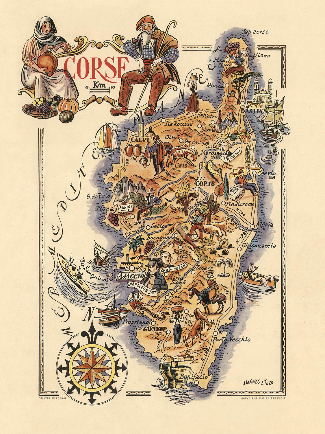 En todo el mapa se entretejen elementos de importancia histórica, con ilustraciones de figuras notables como Napoleón Bonaparte, que nació en Ajaccio. El mapa también destaca la artesanía y los oficios locales, como la pesca y la agricultura, y ofrece una idea de los medios de vida tradicionales de los corsos. Esta combinación de elementos históricos y culturales, combinada con la destreza artística de Liozu, hace del mapa "Córcega" una pieza notable que celebra el rico patrimonio y el esplendor natural de Córcega.