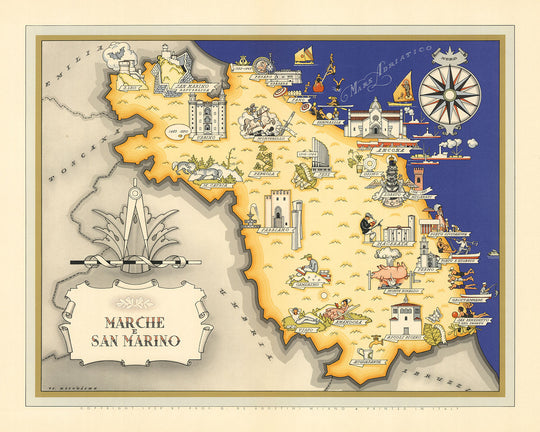 Una de las características más llamativas de este mapa es la inclusión de viñetas, que son pequeñas ilustraciones detalladas que proporcionan información adicional sobre la región. Estas viñetas representan varios aspectos de la vida en Marche y San Marino, incluyendo agricultura, industria, arquitectura y transporte. Ofrecen un vistazo a la rica historia y cultura de la región, haciendo que el mapa no sea solo una referencia geográfica, sino también un documento histórico.
