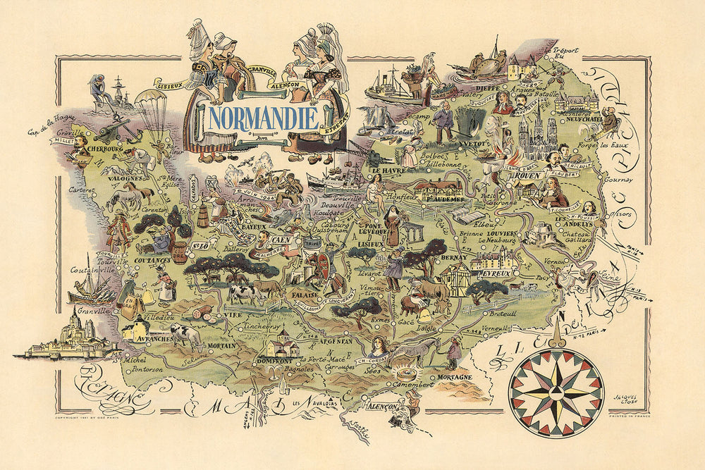 El diseño del mapa es un testimonio de la meticulosa atención al detalle de Liozu y su pasión por contar historias a través de la cartografía. Cada elemento del mapa, desde los bulliciosos puertos de Le Havre y Cherbourg hasta la serena campiña de Lisieux y Alençon, se representa con una riqueza que invita a los espectadores a explorar y descubrir. El enfoque temático resalta el diverso patrimonio cultural de la región, mostrando monumentos como el icónico Mont Saint-Michel, la histórica Catedral de Ruan y el pintoresco pueblo portuario de Honfleur. Estas ilustraciones no son solo representaciones precisas, sino también interpretaciones artísticas que capturan el espíritu de cada lugar.