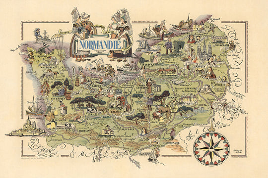 La belleza natural de Normandía es otro tema clave de este mapa. La escénica Côte Fleurie, conocida por su impresionante costa, y los dramáticos acantilados blancos de Étretat se ilustran con un sentido de asombro y admiración. El mapa también destaca el patrimonio agrícola de la región, con representaciones del famoso queso Camembert y los exuberantes paisajes pastorales que definen gran parte de Normandía. Esta mezcla de elementos naturales y culturales crea una visión holística de la región, ofreciendo una instantánea completa de su carácter único.