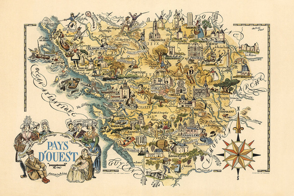 Adéntrese en el cautivador mundo de la cartografía de mediados del siglo XX con el mapa "Pays d'Ouest", meticulosamente elaborado por el estimado Jacques Liozu en 1951. Este mapa pictórico a color captura elegantemente la esencia de las regiones occidentales de Francia, particularmente Poitou-Charentes y la parte sur de Pays de la Loire. La maestría artística de Liozu da vida a la rica tapicería de esta región histórica, ofreciendo un festín visual que es tanto informativo como estéticamente agradable. La rosa de los vientos decorativa, una característica distintiva del trabajo de Liozu, no solo sirve como una ayuda de navegación, sino que también añade un toque de estilo artístico, convirtiendo este mapa en una verdadera pieza de colección.