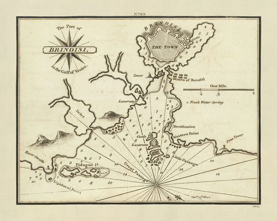 Este mapa es un tesoro para los entusiastas de la historia marítima y la cartografía, ofreciendo una ventana al pasado donde la confluencia de lo militar, el comercio y la navegación moldearon los destinos de ciudades costeras como Brindisi. La representación detallada de elementos costeros y marítimos hace de este mapa un recurso valioso para entender el contexto geográfico e histórico de la zona, reflejando las complejidades de una región que ha sido un centro marítimo fundamental a lo largo de los siglos.