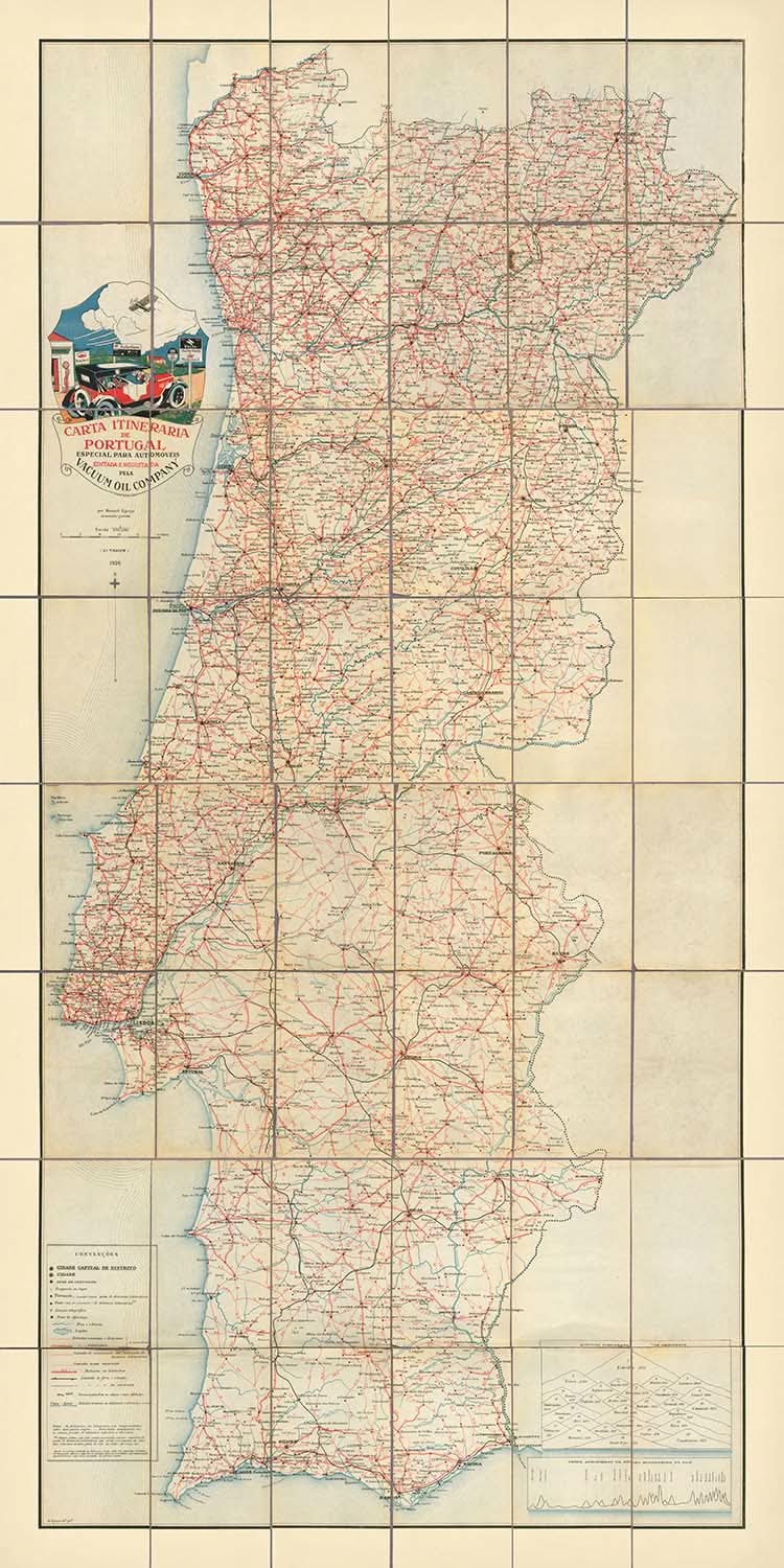 Antigua y rara mapa de carreteras de Portugal, 1926: Lisboa, Oporto, Automovilismo, Compañía de Aceite al Vacío