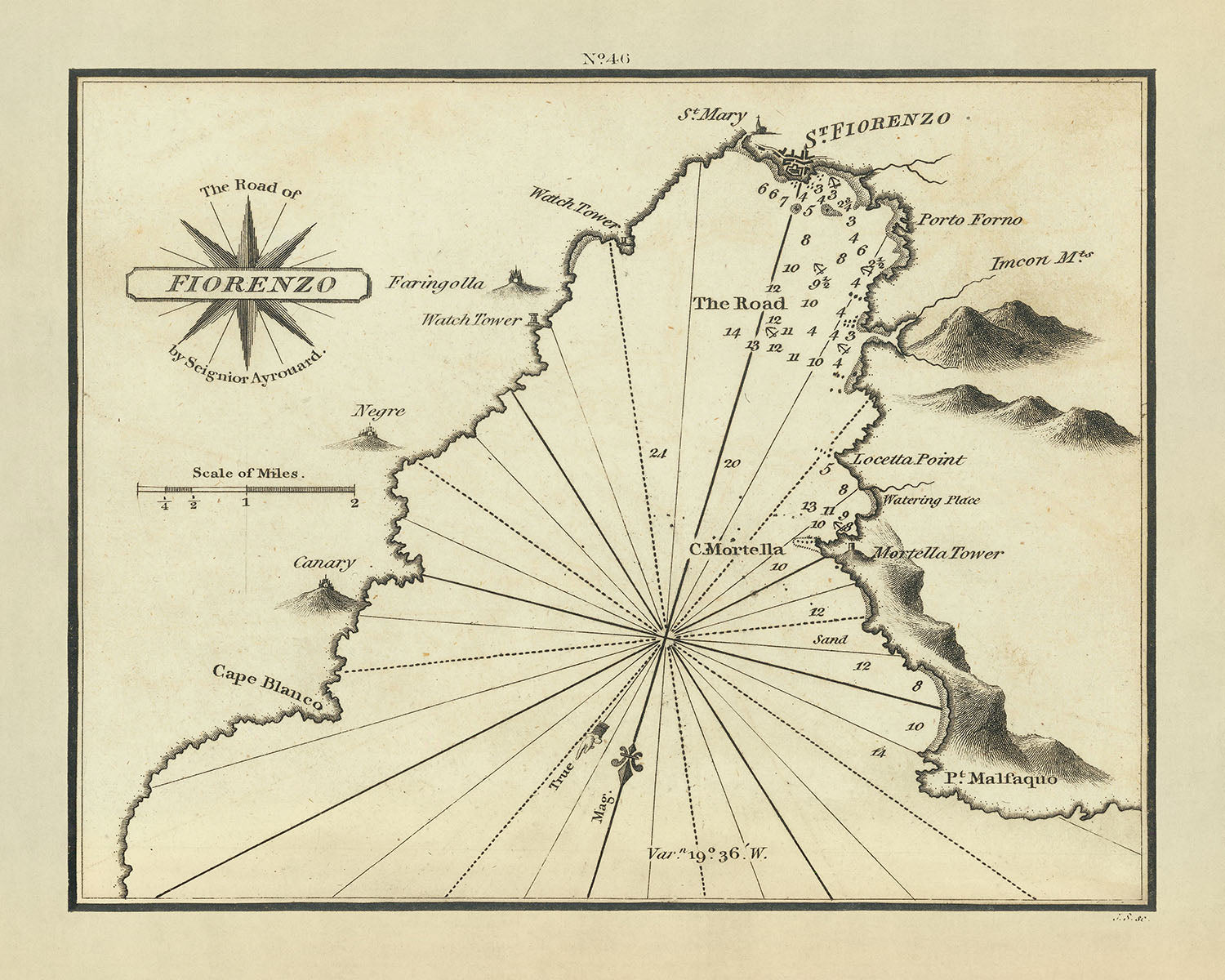 La experiencia de William Heather en hidrografía se ejemplifica en la precisión de los sondeos y los detalles de navegación presentados en esta carta. La inclusión de diversas características topográficas junto con los anclajes realza su utilidad y valor histórico. El mapa traza meticulosamente las nebulosas aguas alrededor del Golfo de San Fiorenzo y los terrenos escarpados de las Montañas Nebbio, brindando una visión integral de los desafíos geográficos de la región para los navegantes de la época. Este nivel de detalle no sólo ayudó a los navegantes, sino que ahora sirve como una visión fascinante de los estándares cartográficos y los desafíos de la época.